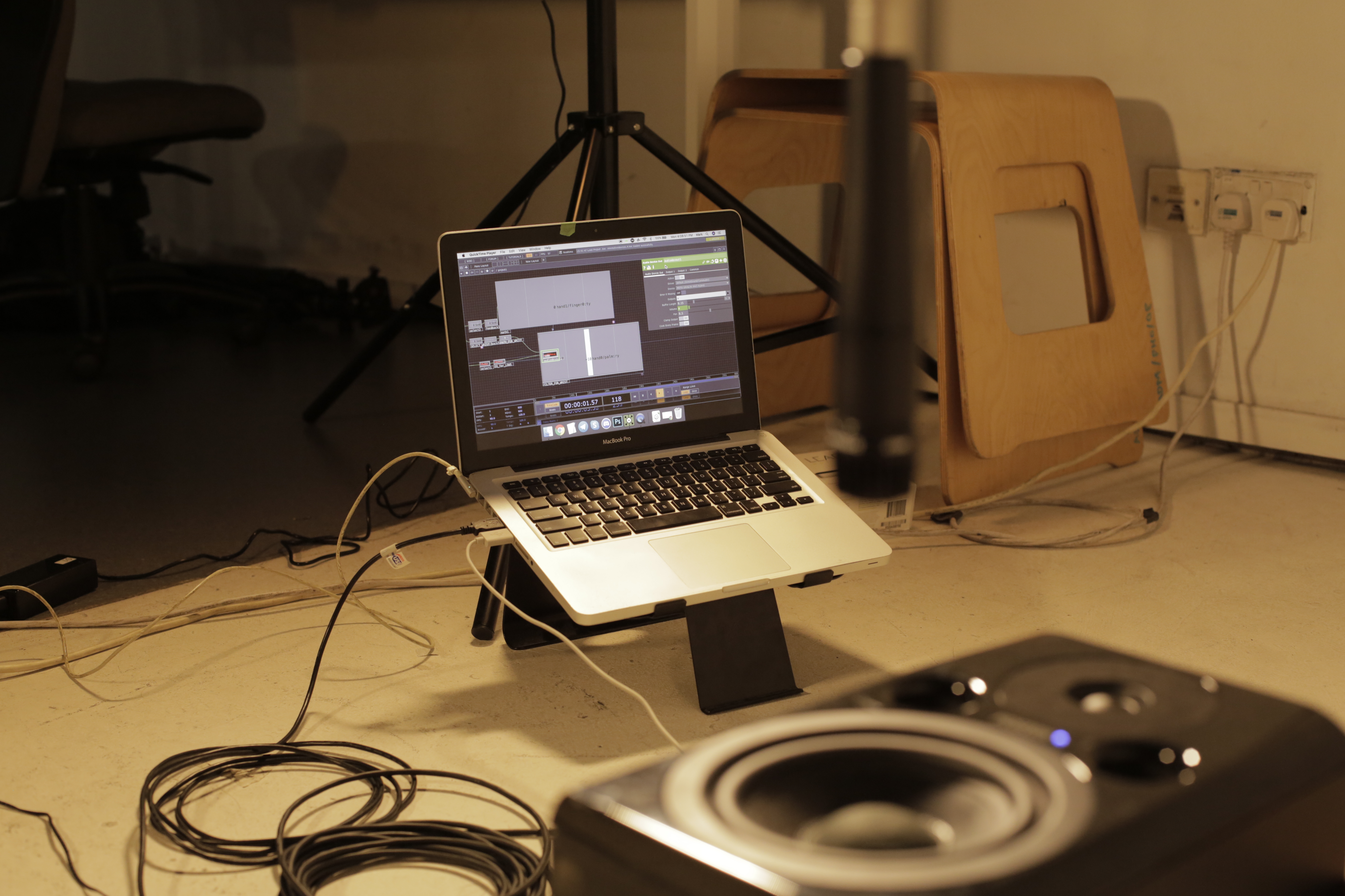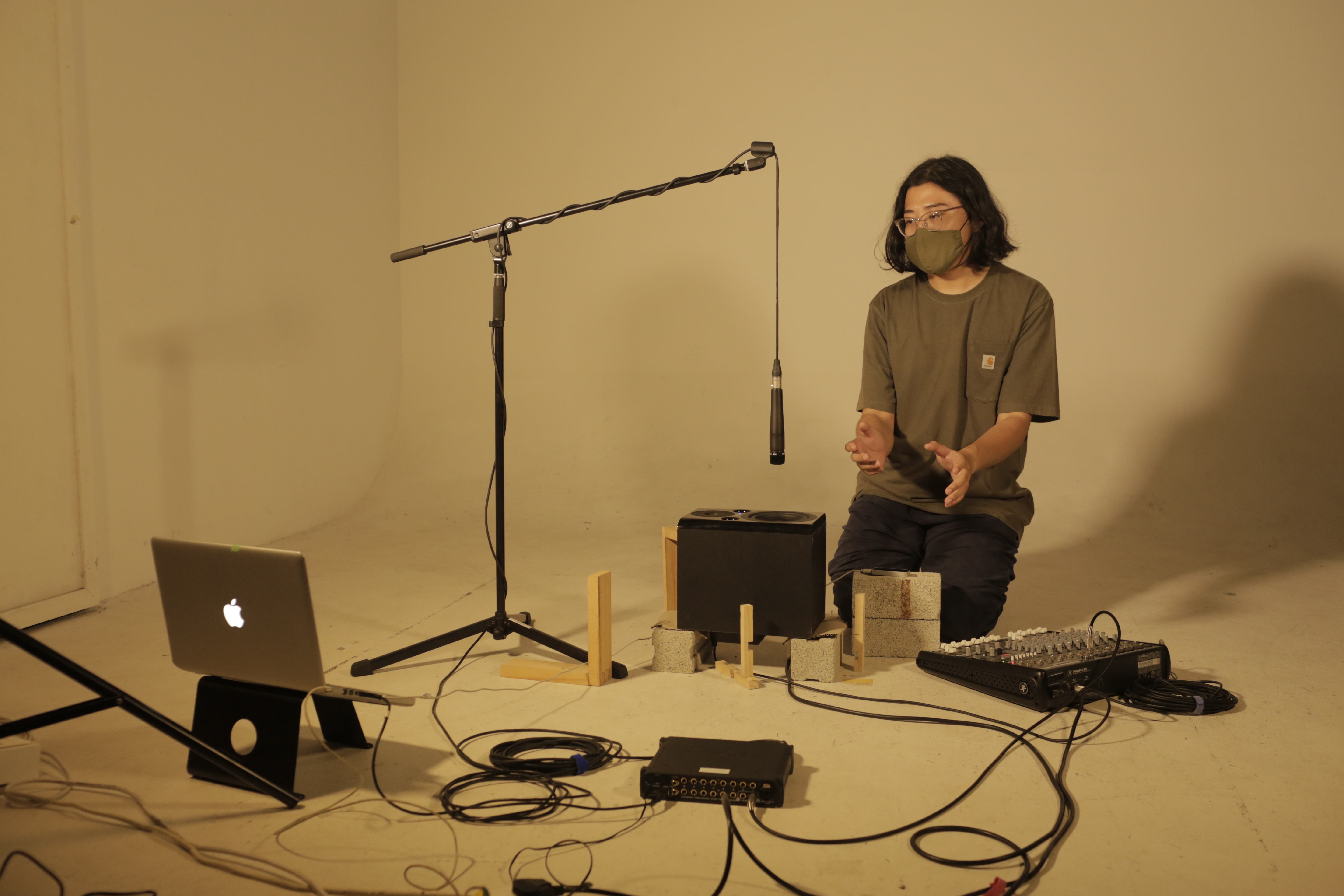 A feedback loop is created by a microphone hovering over a speaker. As the sound of the feedback grows exponentially, the user controls the volume and pitch of it through the gestures of both hands.